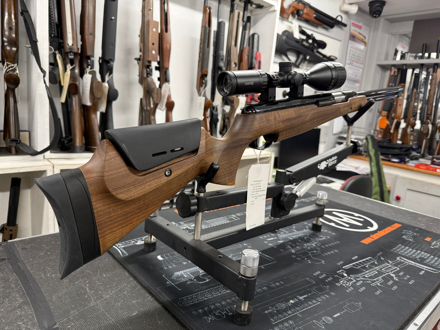 ALL SECOND HAND AIR RIFLES COME WITH 3 MONTHS WARRANTY Excellent condition and fully tested second hand Air Arms TX200 US .177. The gun features an ambidextrous walnut stock with adjustable cheek piece and under lever action. It is fitted with a Hawke fast mount 3-12x50 AO IR scope. |