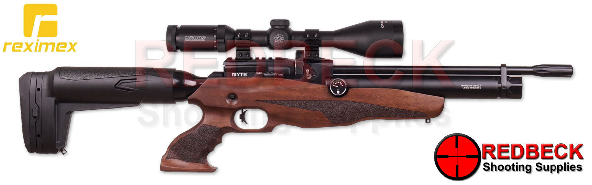 The Reximex Myth Walnut is a new compact air rifle that features an air bottle to the rear and an air cylinder to the front. Due to this, the rifle is capable of approximately 210 shots per fill at 200 bar. Featuring a Walnut stock with a pistol grip. The Myth has a cocking lever which is located on the right side of the action. You will find the manual safety to the rear of the stock which can be easily switched between on and off. The rifle also has a fully adjustable 2 stage trigger.