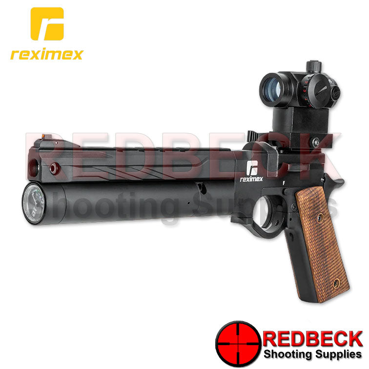DESCRIPTION The Reximex Mito 11 builds on the original Mito PCP pistol platform. The Mito 11 has a traditional-style 1911 checkered walnut grip to give the feel and aesthetics of the classic 1911 design, combining ergonomic comfort with a timeless look while retaining the performance and consistency of the regulated PCP air pistol system. Designed for consistent target shooting performance, plus plenty of fun for plinking and light field use. The Pistol comes well presented in a sturdy soft case. The action features an 11mm dovetail rail so sights can be easily fitted. The Mito comes supplied with: