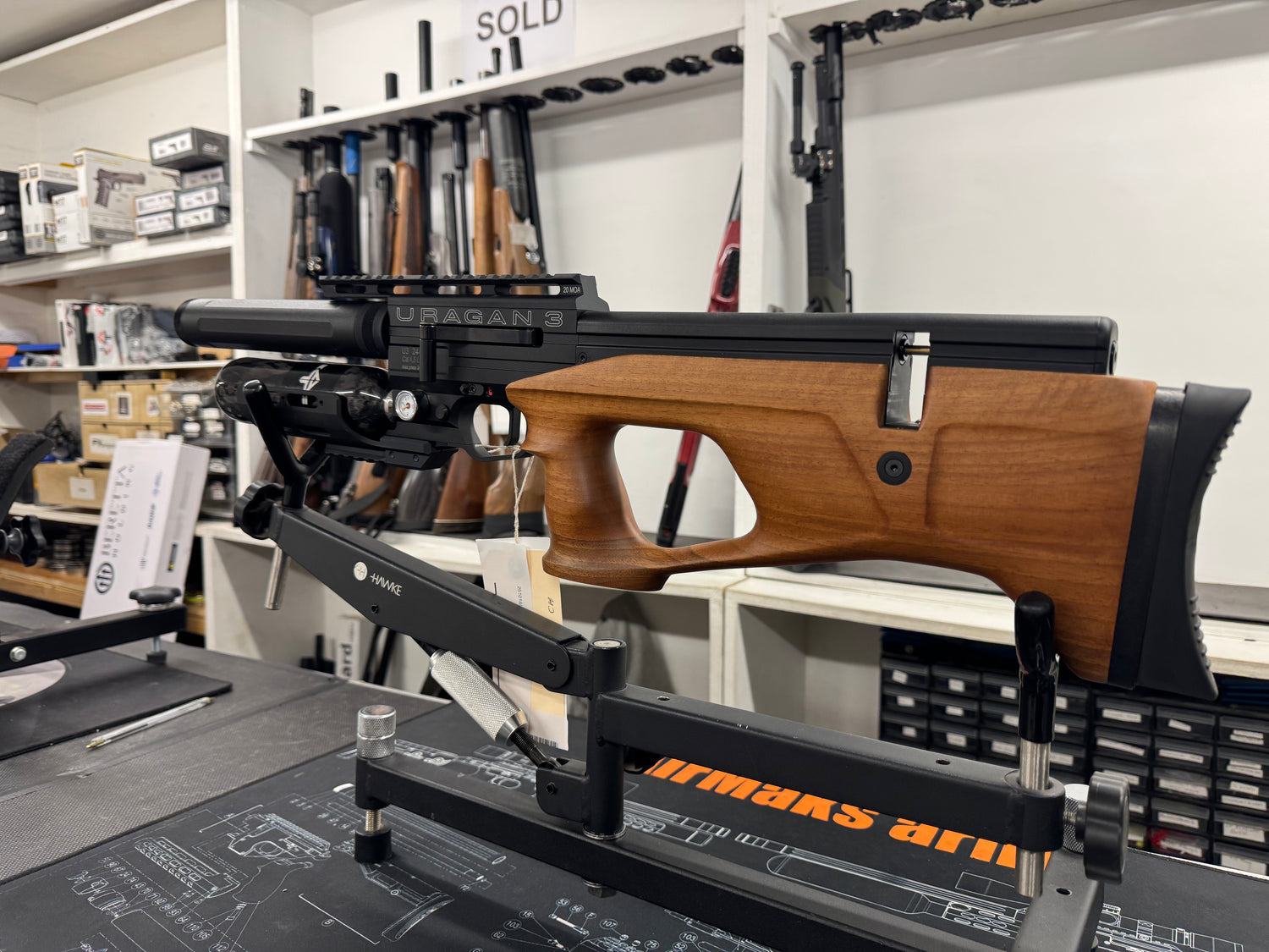 Excellent condition and fully tested AGT Uragan 3 .177. The gun features an ambidextrous walnut stock with left hand lever. It is supplied with two magazines and a filling adapter. This rifle is supplied with 3 months warranty.