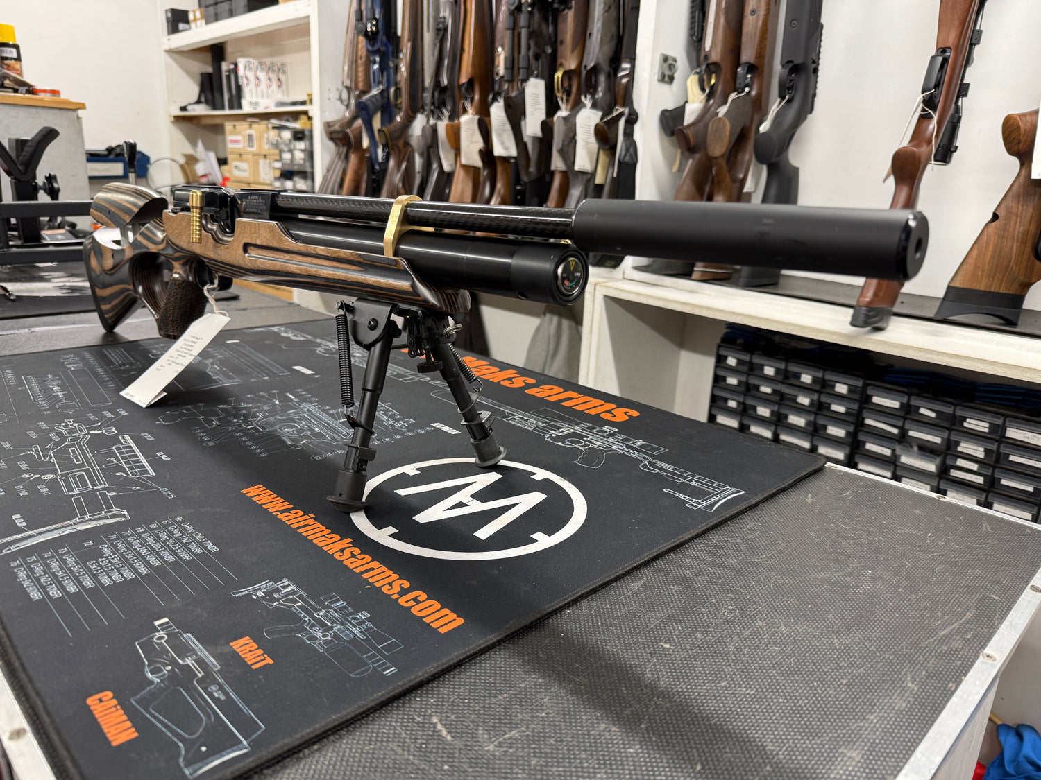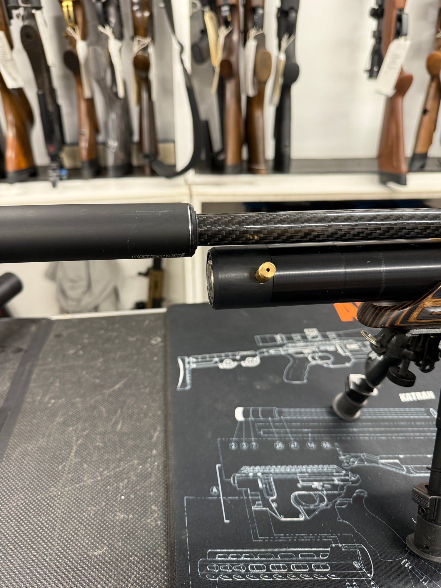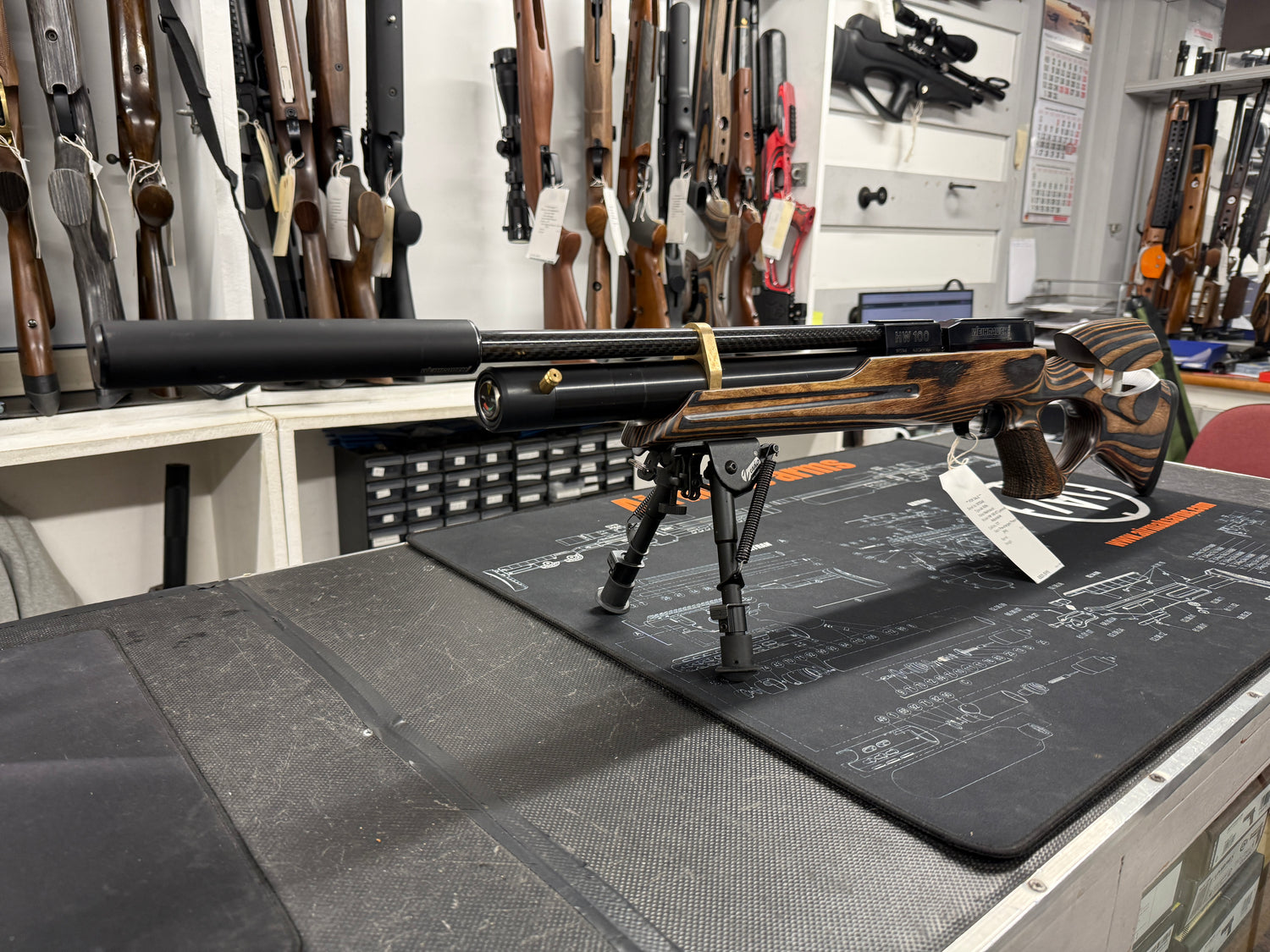 ALL SECOND HAND AIR RIFLES COME WITH 3 MONTHS WARRANTY Good condition and fully tested second hand Weihrauch HW100KT .177. The gun features an ambidextrous laminate stock with right hand lever. It has been fitted with a lightweight cylinder, bipod, Weihrauch silencer, carbon fibre barrel sleeve and brass barrel band . Also supplied with the rifle is two magazines and a filling adapter. There are a couple of small marks on the stock as pictured. |