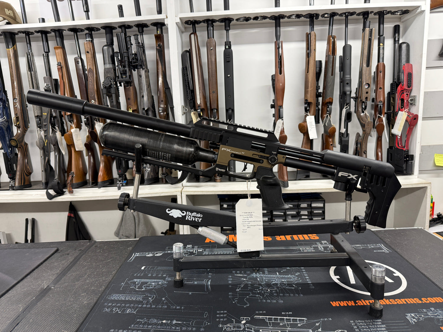 ALL SECOND HAND AIR RIFLES COME WITH 3 MONTHS WARRANTY Excellent condition and fully tested second hand FX Impact MK2 in .177 The gun features a right handed bronze and black tactical stock with right handed lever. The rifle has been fitted with an extended Saber rail and FX moderator and comes supplied with a magazine and filling adapter. |