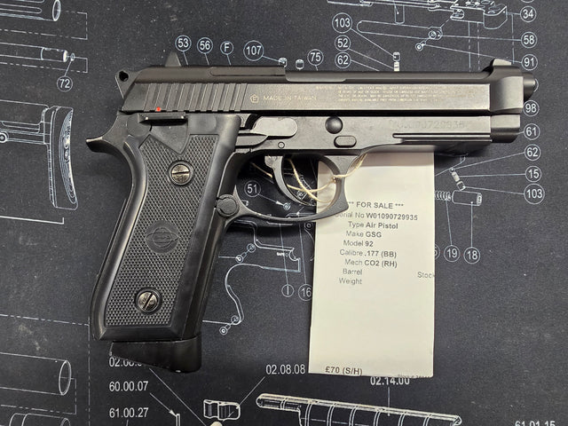 ALL SECOND HAND AIR PISTOLS COME WITH THREE MONTHS WARRANTY Good condition and fully tested second hand GSG 92 .177 (BB). The gun features an ambidextrous grip with open sights. It runs on the 12g CO2 capsules and fires 4.5mm metal BB's. |
