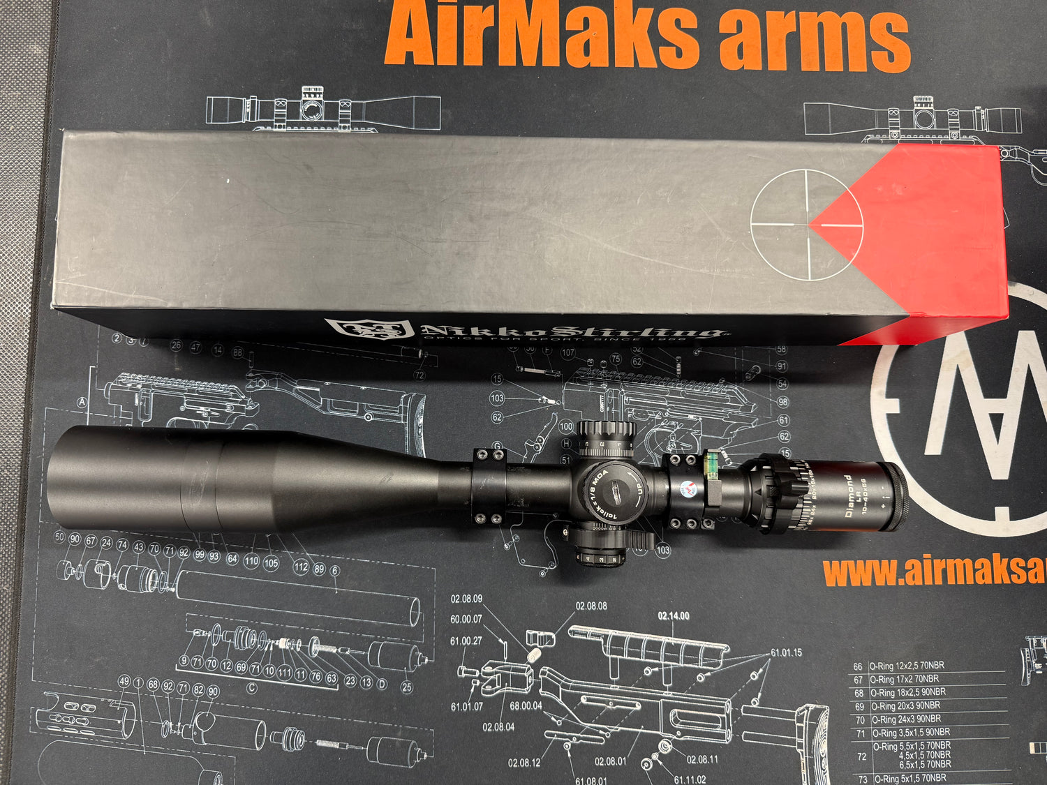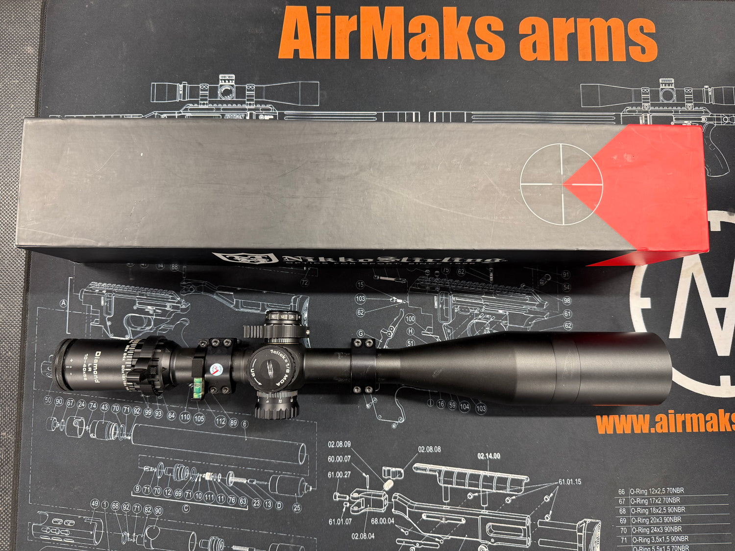 Second hand Nikko Stirling Diamond Long Range 10-40x56. Comes with the original box, a sun shade and a set of sports match dovetail mounts. |