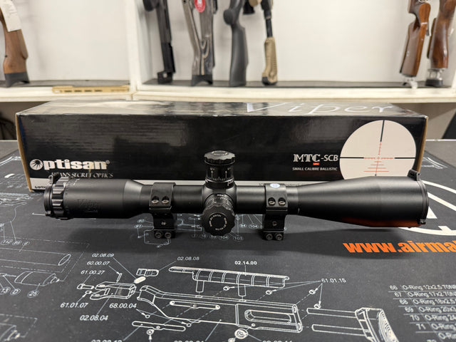 Second hand Optisan MTC Viper 10x44. Comes supplied with the original box, a set of flip up covers and a set of sports match adjustable dovetail mounts. |