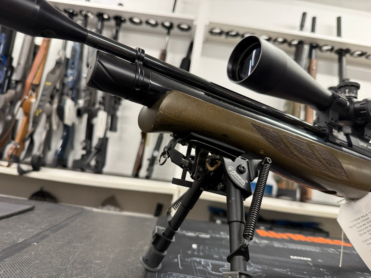 ALL SECOND HAND AIR RIFLES COME WITH 3 MONTHS WARRANTY Fair condition and fully tested second hand Air Arms S410 .22. The gun features an ambidextrous super lite green stock with right hand bolt. It has been fitted with a 6-24x50 scope, a moderator and a bipod. Also supplied with the gun is a magazine and fill adapter. There are quite a few marks on the stock as pictured. |