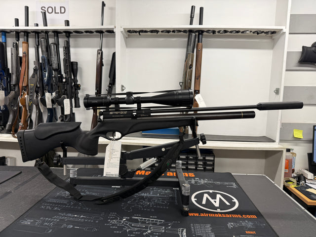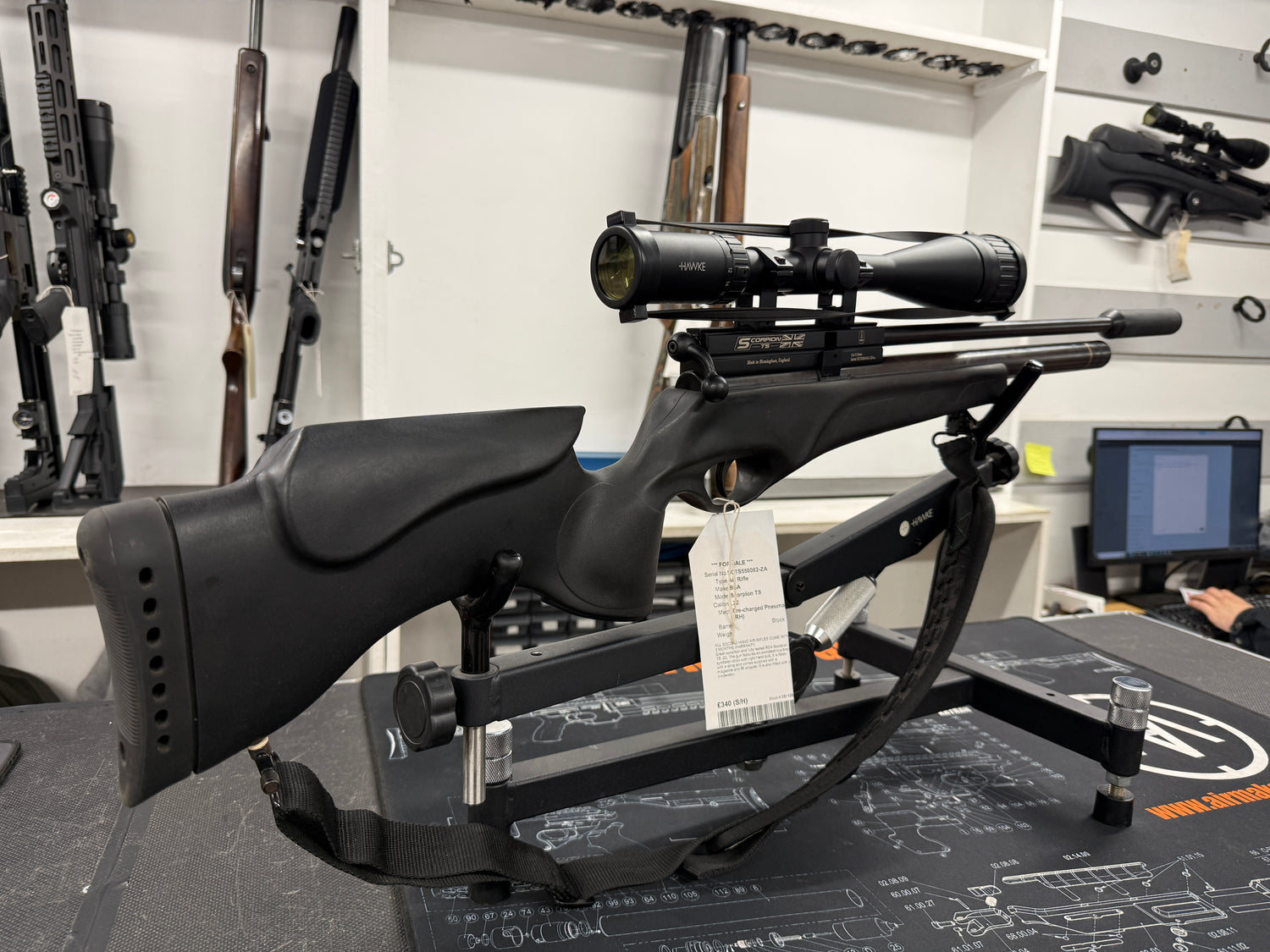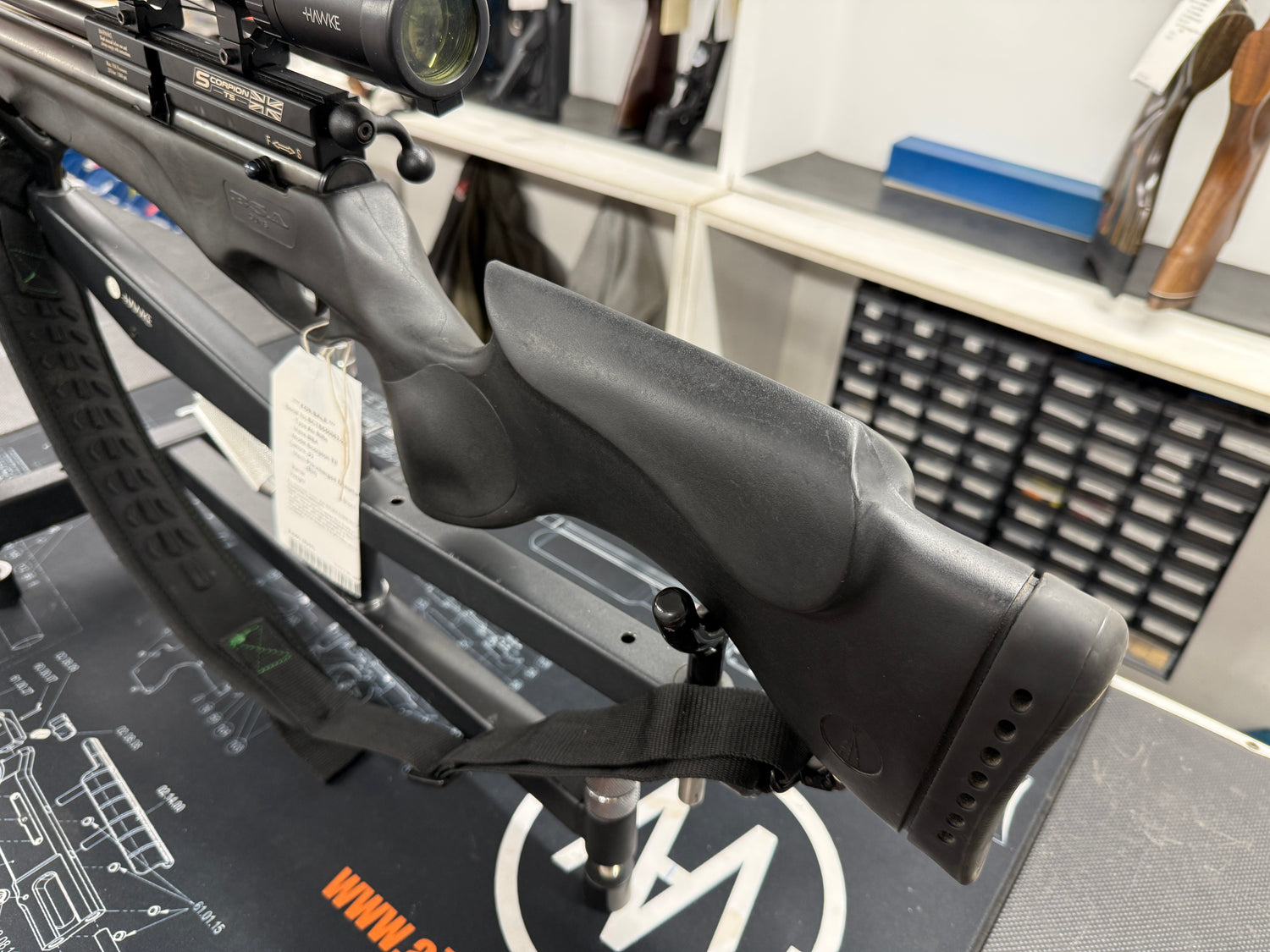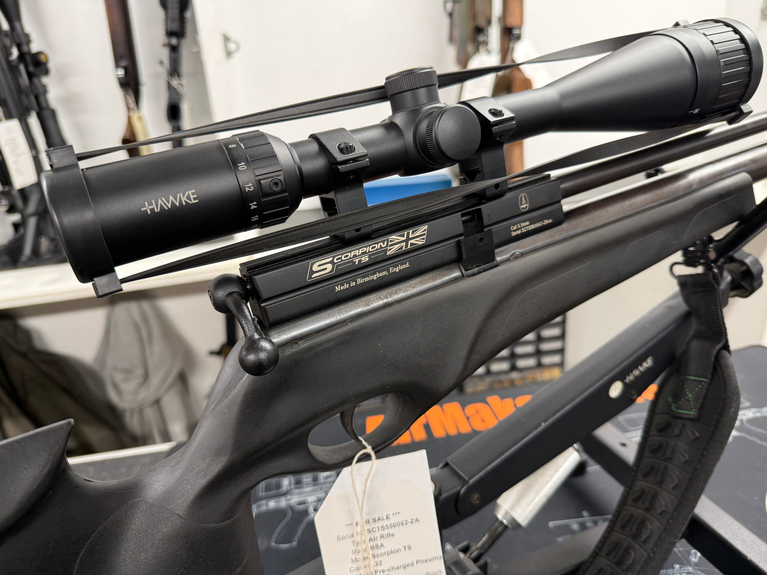 ALL SECOND HAND AIR RIFLES COME WITH 3 MONTHS WARRANTY Fair condition and fully tested BSA Scorpion TS .22. The gun features an ambidextrous black synthetic stock with right hand bolt. It is fitted with a Hawke 6-24x50 AO IR scope, a sling and a moderator. Also supplied with the rifle is a magazine and fill adapter. There are some marks on the stock and some pitting on the metal work as pictured. |