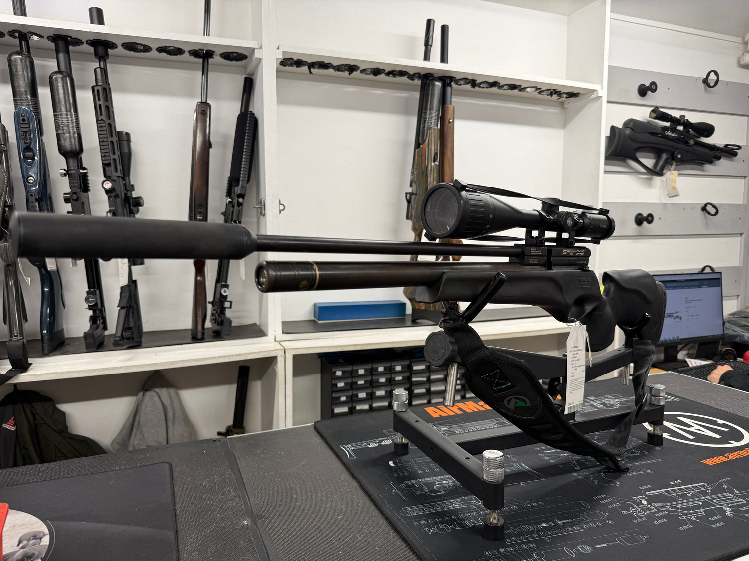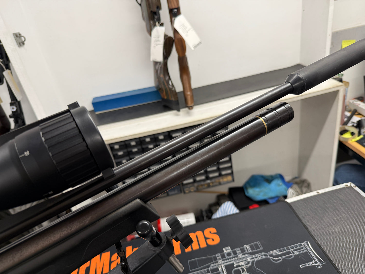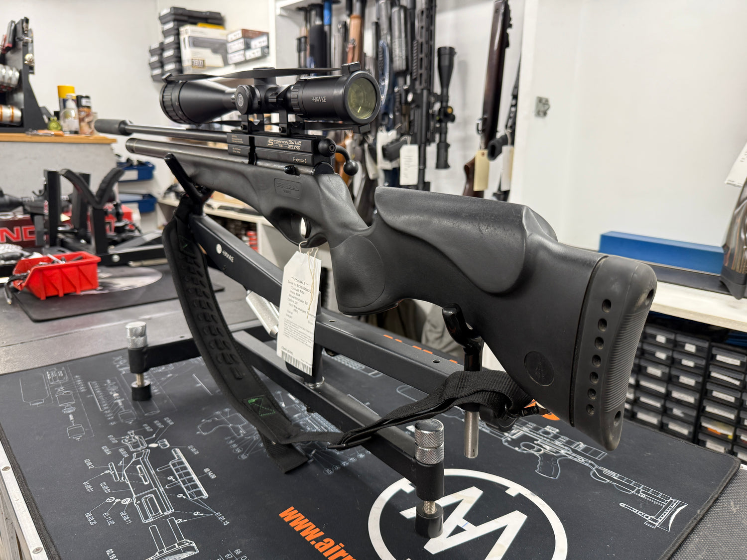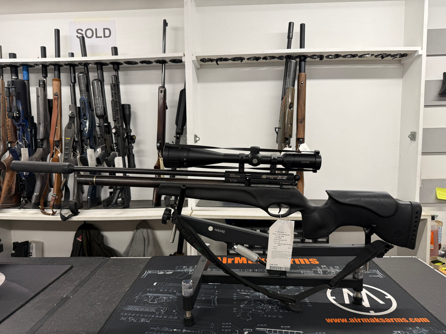 ALL SECOND HAND AIR RIFLES COME WITH 3 MONTHS WARRANTY Fair condition and fully tested BSA Scorpion TS .22. The gun features an ambidextrous black synthetic stock with right hand bolt. It is fitted with a Hawke 6-24x50 AO IR scope, a sling and a moderator. Also supplied with the rifle is a magazine and fill adapter. There are some marks on the stock and some pitting on the metal work as pictured. |