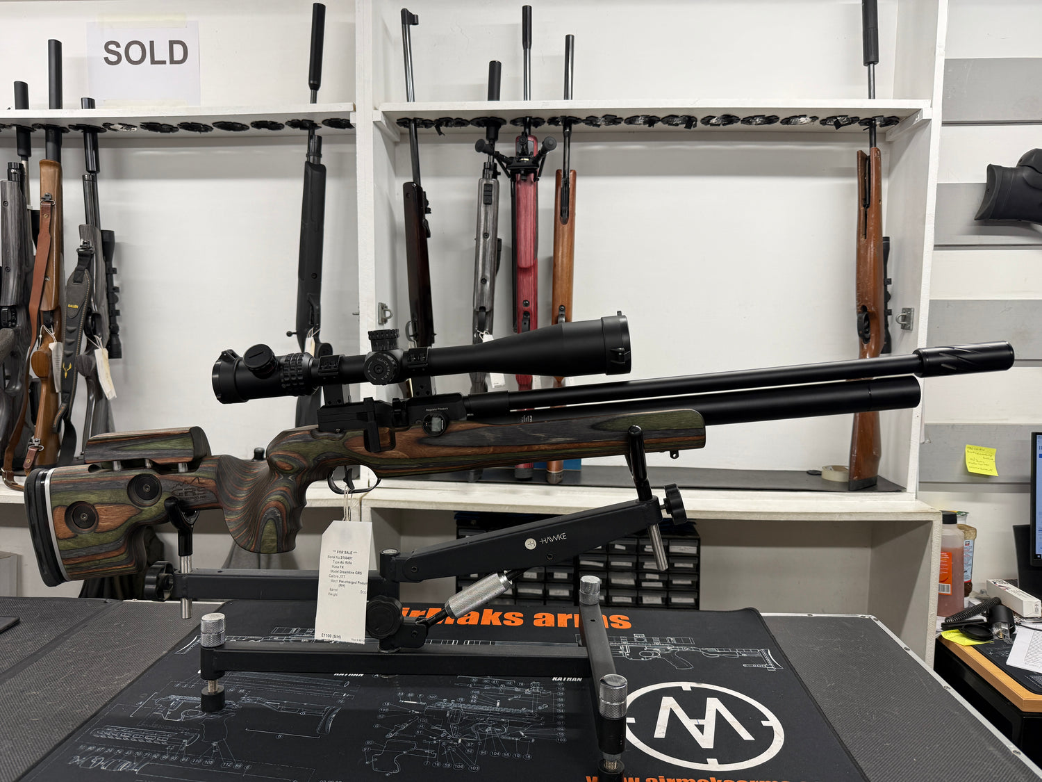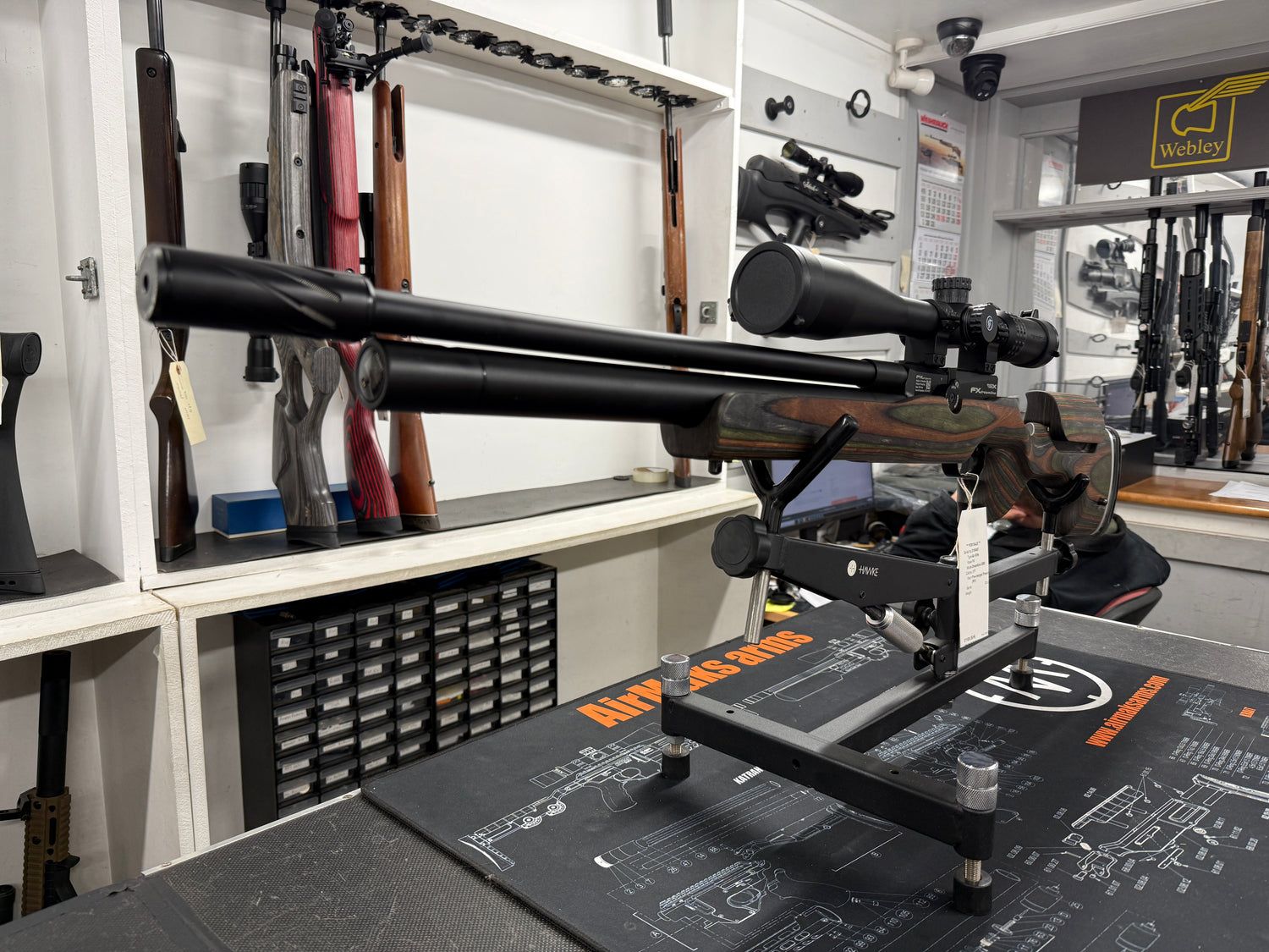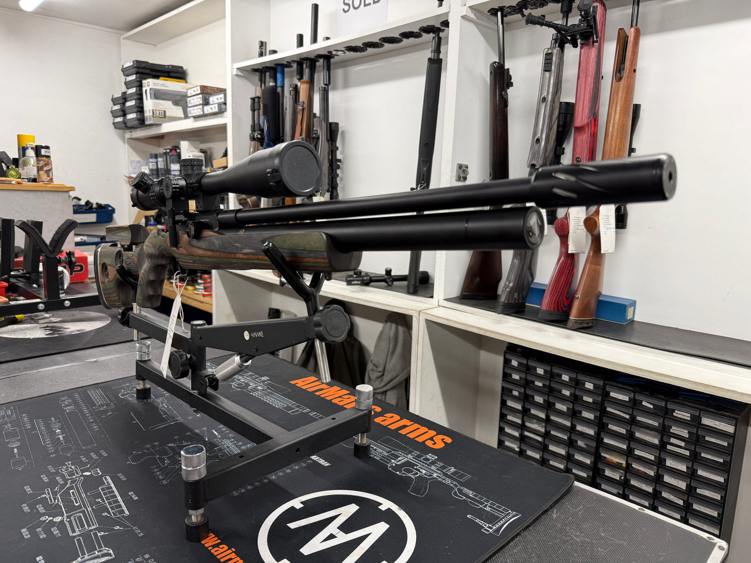 Excellent condition and fully tested second hand FX Dreamline Classic .177. The gun features a right handed GRS green mountain camo stock with right hand side lever. It is fitted with digital gauges, a Vector Optics sentinel 8-32x50 scope and a Huggett Atom silencer. Also supplied with the rifle is a single shot loader, a magazine and a filling adapter.