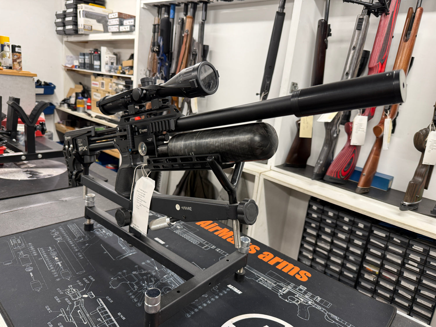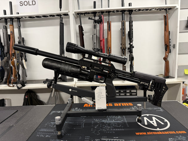 Excellent condition and fully tested second hand FX Impact X in 177 calibre. The gun features a right handed stock with right hand side lever. It has been fitted with a Hawke Vantage 3-9x40 AO scope, moderator, Saber Tactical cheek riser, Form cheek piece and Saber Tactical under rail.  Supplied with the rifle is a magazine and a fill adapter.