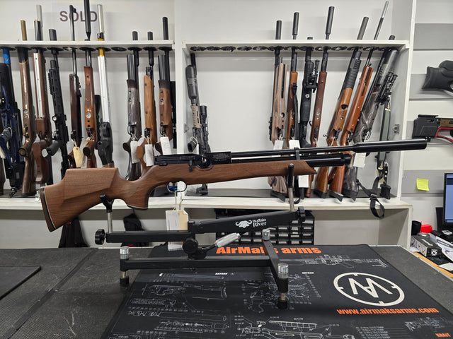 Good condition and fully tested second hand Weihrauch HW100S .177. The rifle is fitted in a right handed walnut sporter stock with right handed lever. It is fitted with a Weihrauch moderator. Also supplied with the rifle is two magazines and a fill adapter. There is a mark on the top scope rail.