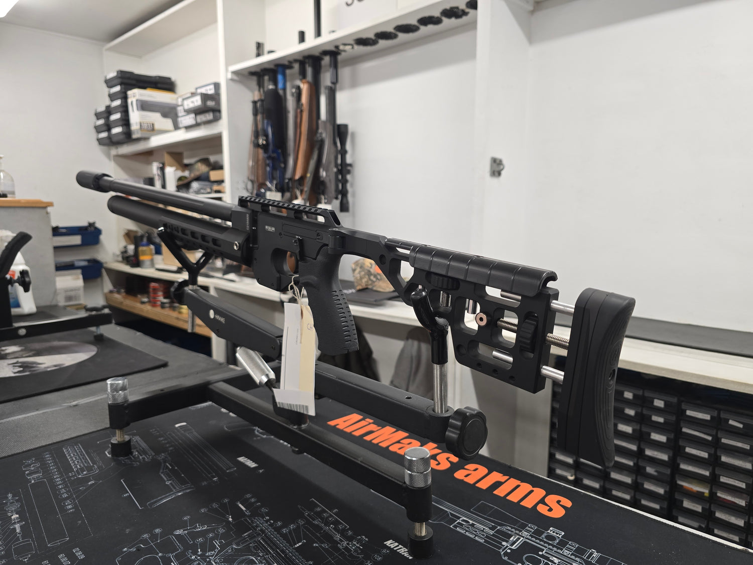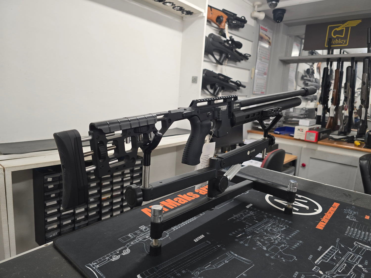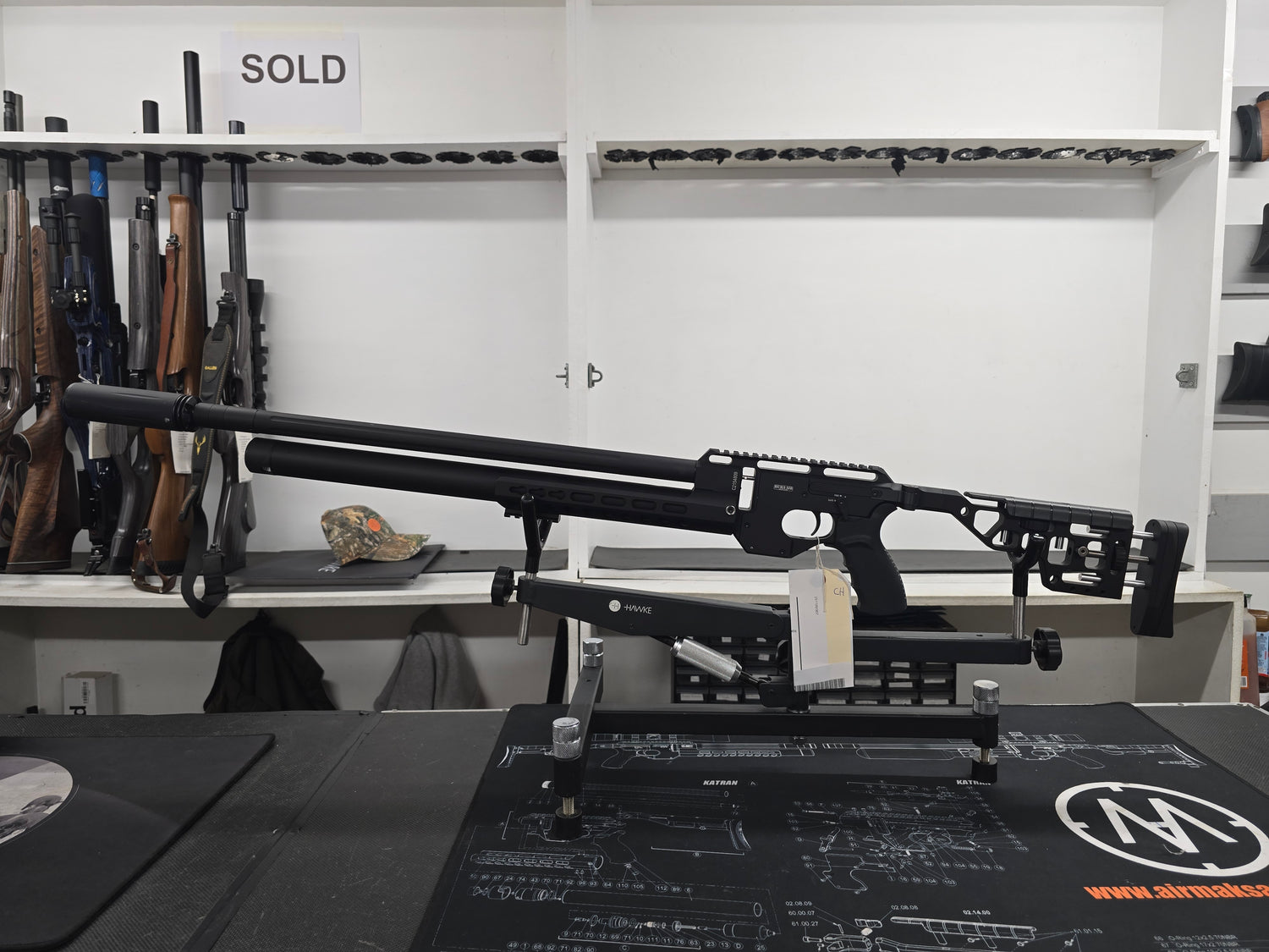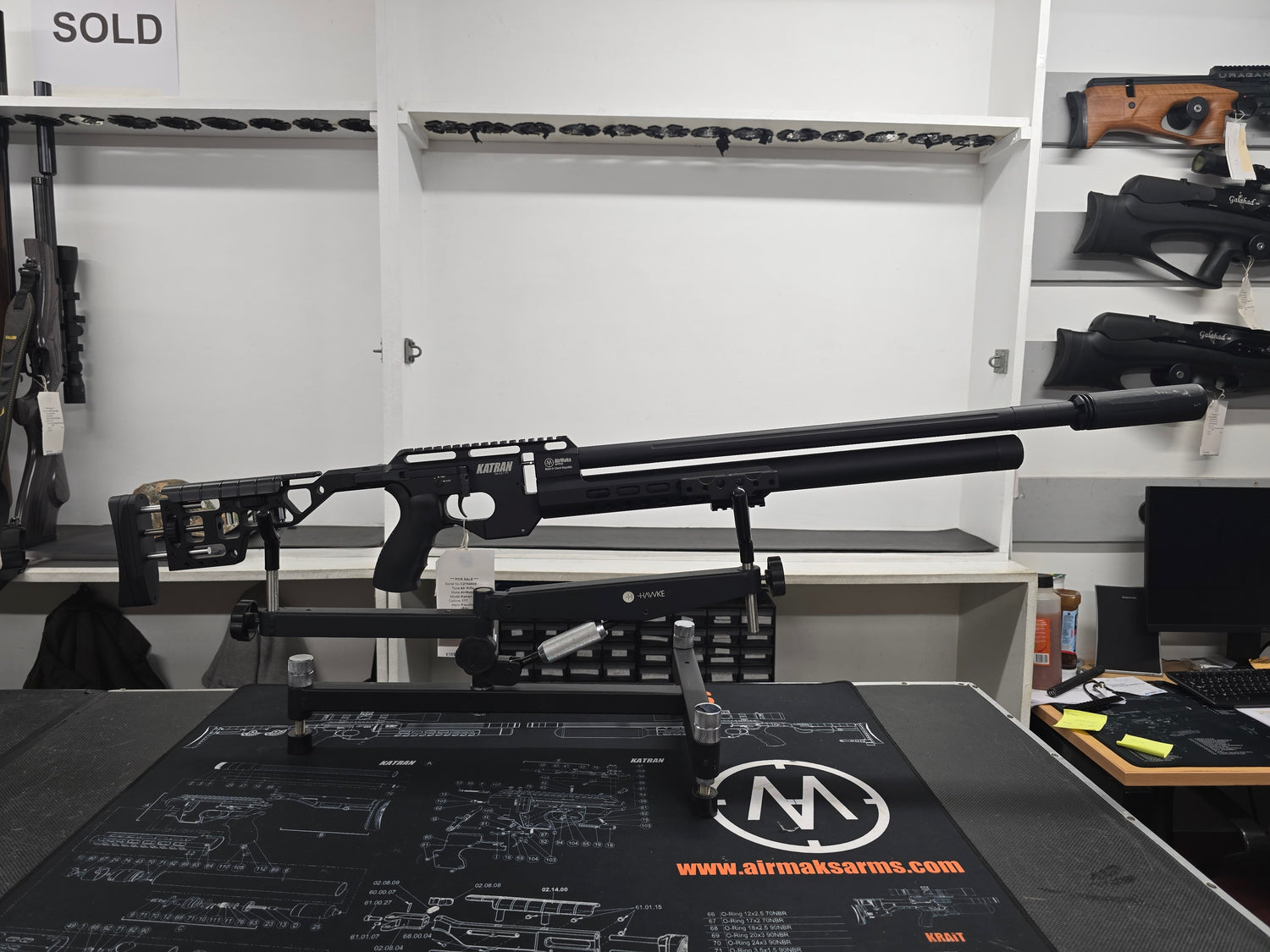 Good condition and fully tested second hand Airmaks Katran  .177. The rifle is fitted with a folding tactical stock. The rifle is supplied with two magazines, a fill adapter, and a hardcase. Also fitted to the rifle is a Weihrauch XLK moderator and an Airmaks magazine holder.