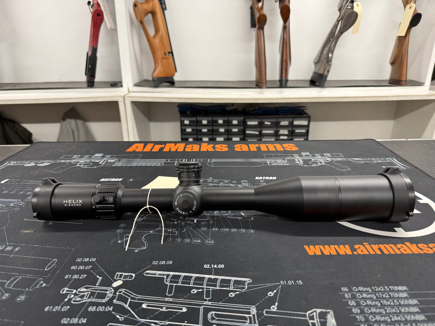Second hand Element Optics Helix Gen 2 6-24x50 SFP APR-1C MRAD. Comes with a sunshade, flip up covers and a throw lever. |