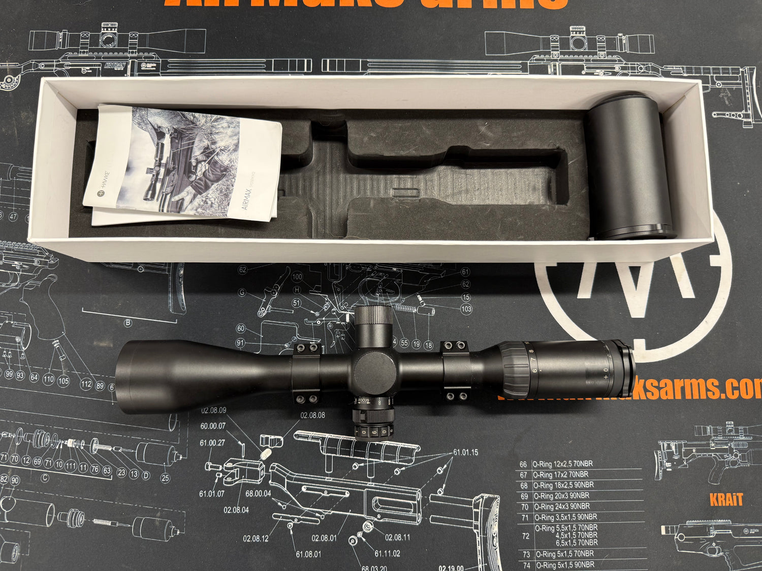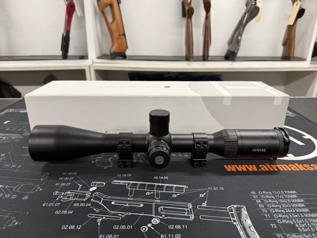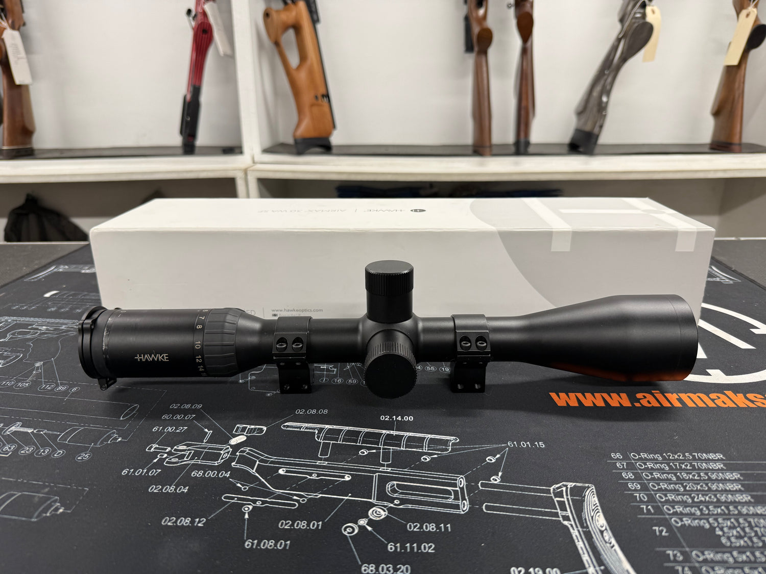 Second hand Hawke Airmax 30 6-24x50. Comes supplied with a set of dovetail mounts, a set of flip up covers and a sun shade. |