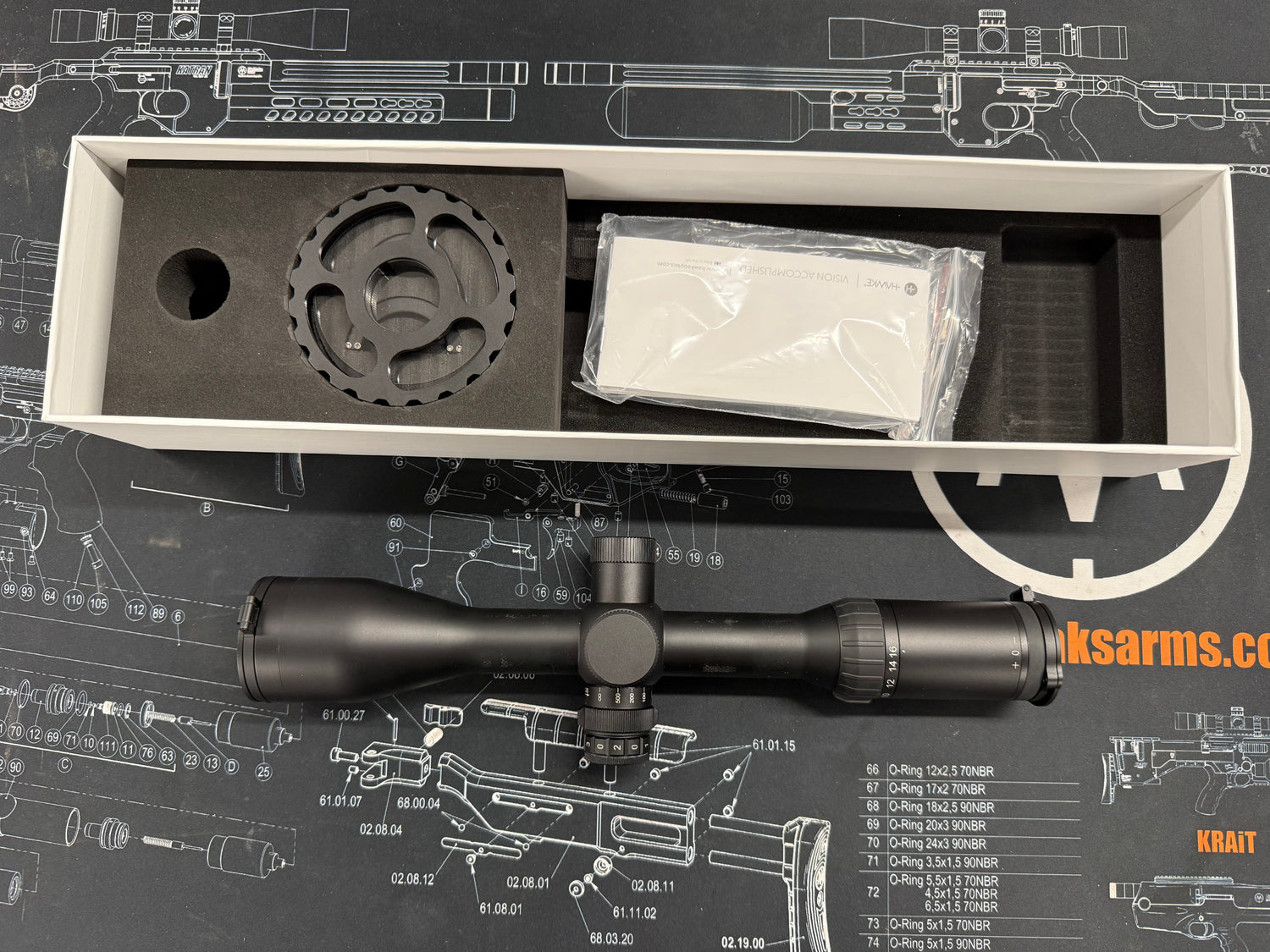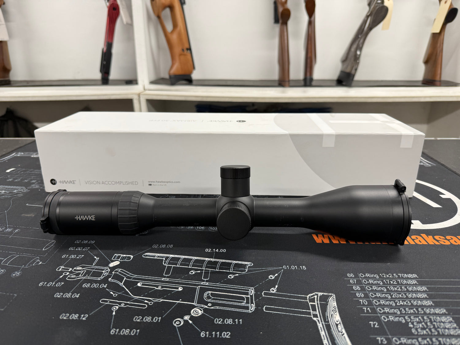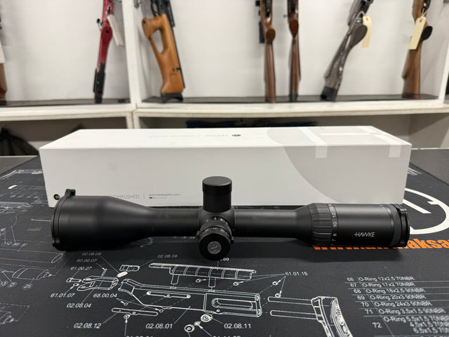 Second hand Hawke Airmax 30 FFP 4-16x50. Comes supplied with the original box, a set of flip up covers and a side wheel. |
