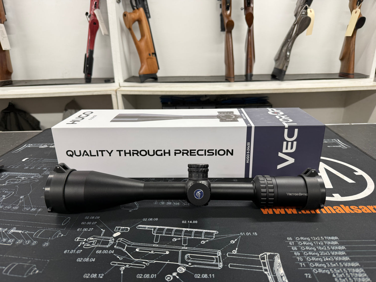 Second hand Vector Optics Hugo 6-24x50. It comes supplied with the original box, a sunshade and a set of flip up covers. |