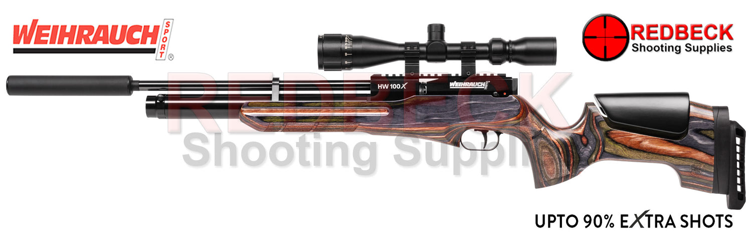 X-tra Pressure, X-tra Shots; The New HW100 X Weihrauch Sport UK are excited to announce the launch of the new HW100 X – the highly anticipated subsequent model of the legendary HW100 which by public demand now features an increased shot count. To celebrate this pivotal milestone in Weihrauch’s development a new HW100 X Sporter Laminate Adjustable launch model, available from December 2025, will feature the following extras: A new ultra efficient regulator is the keystone behind the triumphant model updates. The easily accessible regulator which is fitted into the valve block offers an unparalleled consistent performance, crucially important for improved accuracy. The new cylinder, filled to 250 bar and made from high grade aluminum, offers an overall decrease in weight by 360gm in standard length and 240gm in the karbine version and of course enables those extra shots! The full length HW100 X variant in .177 cal. offers 90% more shots than its predecessor, now sitting at up to 210 shots per fill while the .22 cal now delivers an impressive 250 shots per fill - nearly 80% increase in shots! As expected from Weihrauch’s Precision German Engineering the HW100 models come packed full of features as standard, including; |